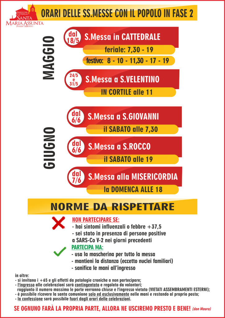 • dispongo che nel periodo che va dal 18 al 31 maggio compreso, l’unica chiesa aperta sarà la Cattedrale. Le chiese di san Rocco, di san Giovanni e della Madonna della Misericordia apriranno dal mese di giugno nei giorni e orari consueti, con l’unica novità che la Messa alla Misericordia la domenica sarà alle ore 18.00 e non più alle ore 17.00 (su richiesta di don Pierluigi). Dunque: a san Rocco il sabato alle ore 19.00 (a partire da sabato 6 giugno); a san Giovanni il sabato alle ore 7.30 (a partire da sabato 6 giugno); alla Misericordia la domenica alle ore 18.00 (a partire da domenica 7 giugno). La chiesetta di Fuori Dazio, date le sue piccole dimensioni, resta chiusa fino a che durano le restrizioni e l’obbligo della distanza minima; comprendo il probabile disappunto di alcuni, ma è doveroso salvaguardare la salute…