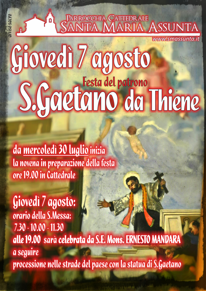 La messa delle 19 sarà celebrata dal S.E. Mons. Ernesto Mandara ed in seguito ci sarà la consueta processione per le vie del paese con la statua di San Gaetano.