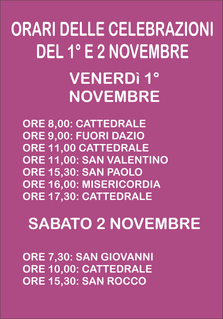 Ecco le Ss. Messe previste per la festività dei Santi e per la commemorazione dei Defunti.