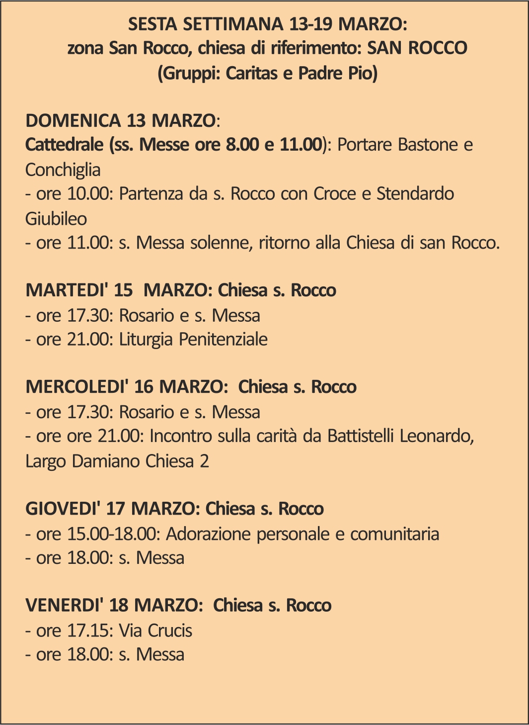 Ricordiamo ancora che le Ss. Messe della domenica sono alle ore 8.00, 11.00 e 18.00 e che, quando non indicato dal programma, la S. Messa quotidiana della sera si celebra in Cattedrale.