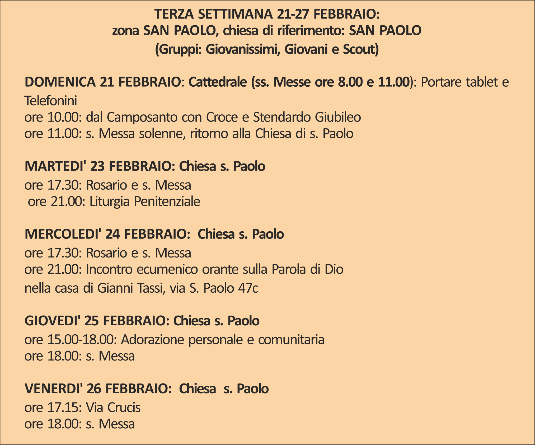 Ricordiamo ancora che le Ss. Messe della domenica sono alle ore 8.00, 11.00 e 18.00 e che, quando non indicato dal programma, la S. Messa quotidiana della sera si celebra in Cattedrale.